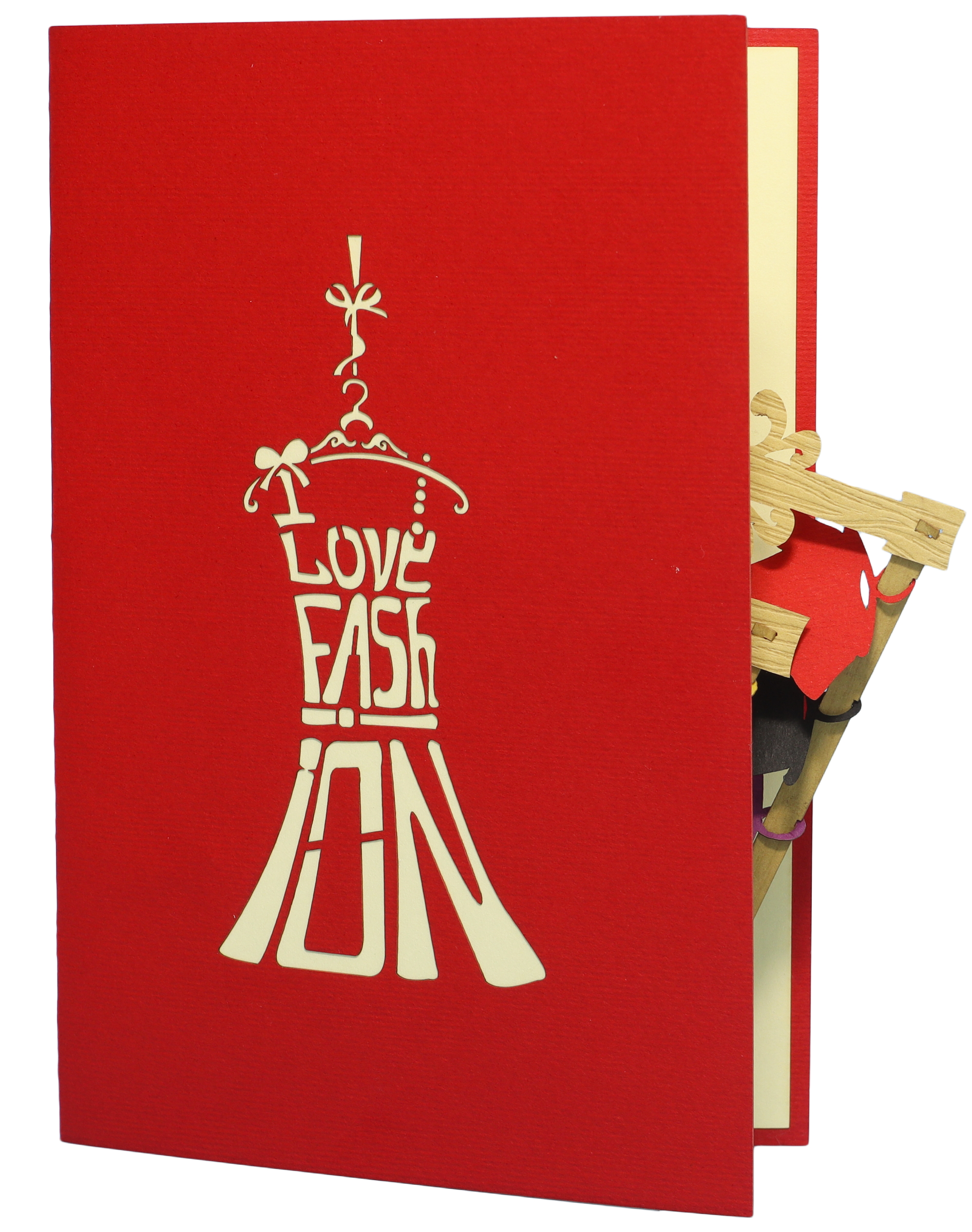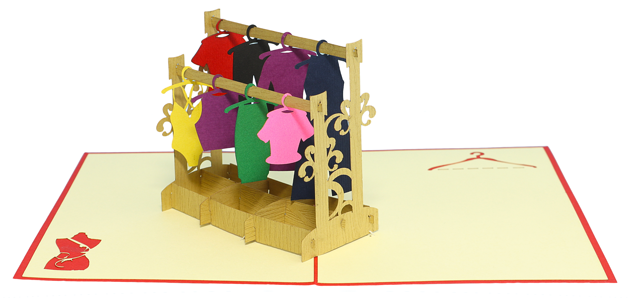 • beim öffnen der Karte entfalten sich die Kleiderstange in 3D in Form einer Klappkarte